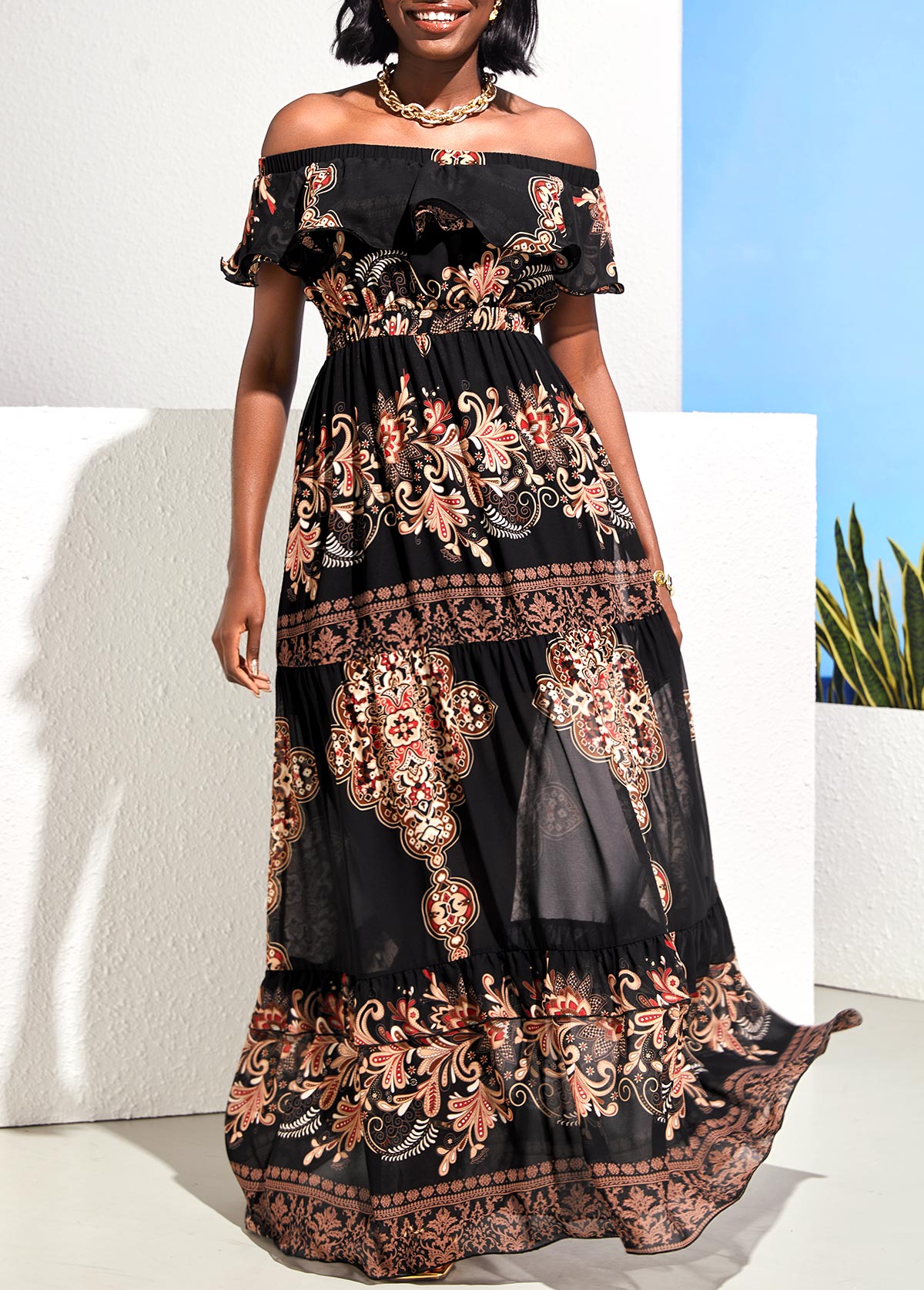 Black Off Shoulder Flounce Tribal Print Maxi Dress